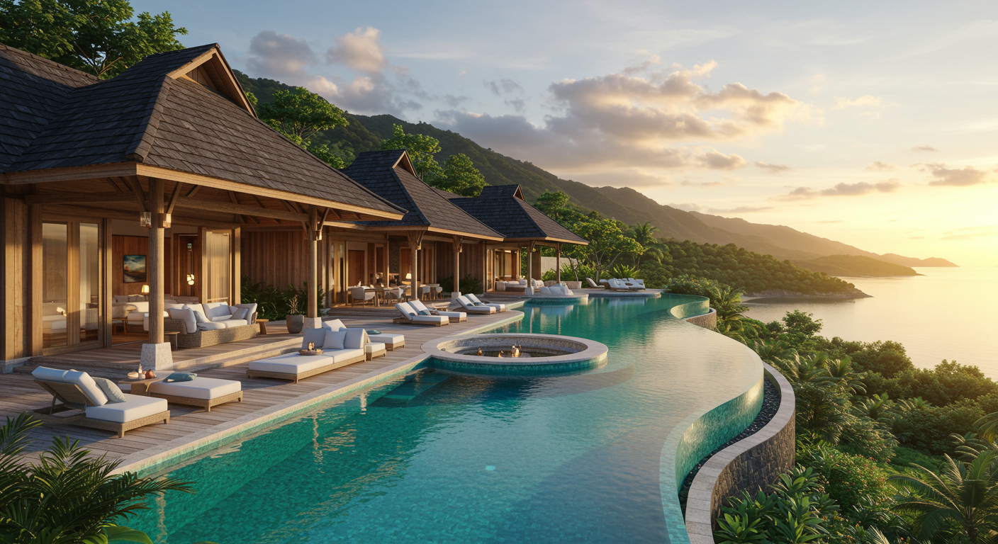 In a picture-perfect island-top setting, this Balinese-inspired residential compound combines exceptional privacy with the luxury and comfort of resort-style living and entertaining. Three acres of tropical beauty surround an extraordinary open-pavilion home and three guest houses with 270-degree ocean, island and sunset views.